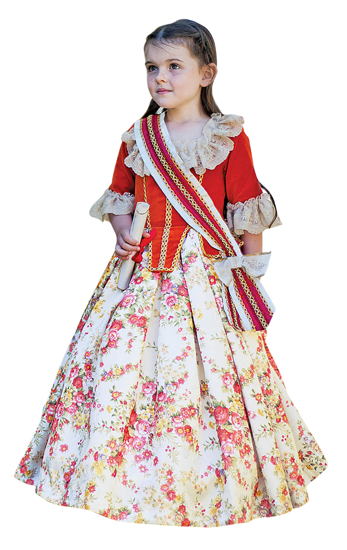 This Kids Floral Countess Costume is made up of a floor-length long floral dress. The top half of the dress has a ruffled collar and sleeves with the body, whilst the body of the corset features bold red and gold colours. The skirt of the dress has a stunning floral pattern all over. Also included is a red sash, matching the top half of the dress.