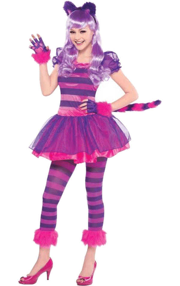 To complete the look, the Teen Cheshire Cat Costume comes with matching pink and purple striped footless tights and fingerless gloves.