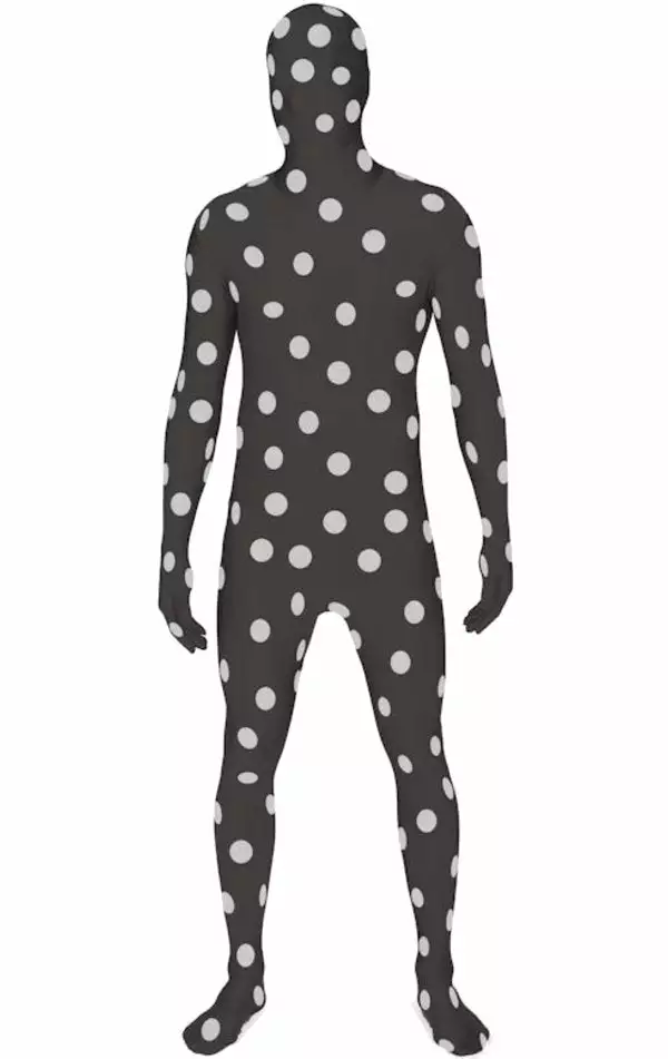 The Black and White spot Morphsuit includes a full black suit covered in white spots from head to toe. Zip fastening is at back and morphsuit logo. You can see through them, drink through them and party in them. Other accessories are available separately.