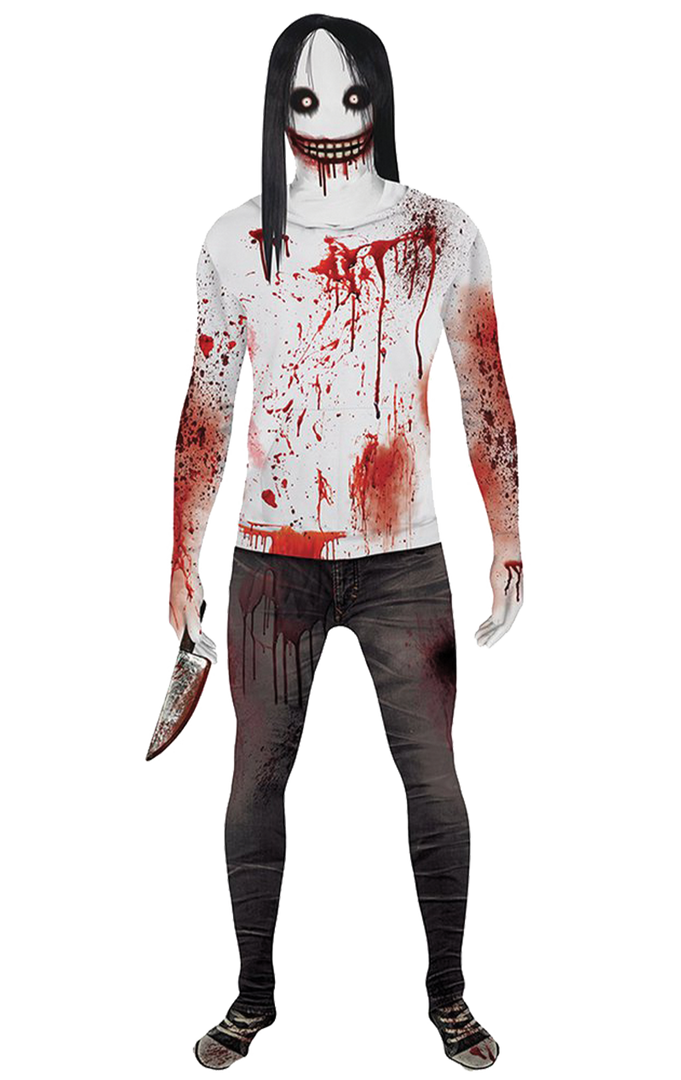 This Halloween, transform into the online phenomenon that is Creepy Pasta’s Jeff the Killer. This Jeff the Killer Creepy Pasta Costume features a skin-tight Morphsuit in white with printed jeans design, attached black hair, the horrifying creepy smile and covered in printed blood splatter and stains. Perfect for Halloween and even a 00’s party!