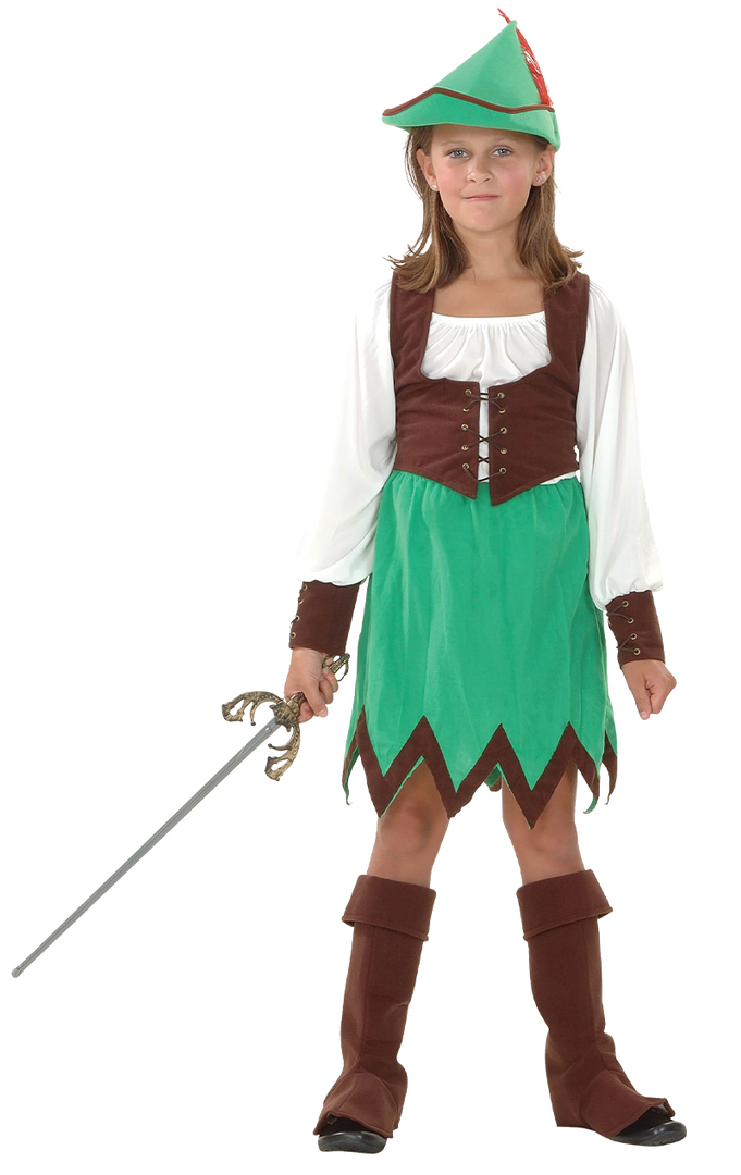 Your child will feel ready for battle in our Kids Robin Hood Girl Costume. It comes complete with a white baggy sleeved top and an attached brown waist coat with tie detailing at the front. It also includes a colourful green skirt with brown jagged edges.