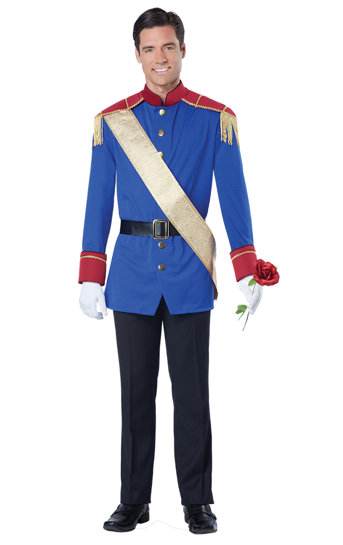 The Men’s Storybook Prince Costume comes complete with a blue long-sleeved jacket, featuring gold button detailing down the front and red detailing on the shoulders and the sleeves. Also included is a black belt to wrap around the waist, plus a gold sash. You are royal, after all.