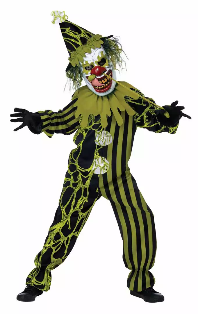 The Kids Boogers the Clown Costume includes a full-body jumpsuit, collar, clown hat and mask. But what’s best of all? The clown appears to be covered in bogies! That’s right; the costume has splats of greenish/yellow bogies and the mask even has stretchy bogies that they can pull. It’s shocking, but the kids will love it…