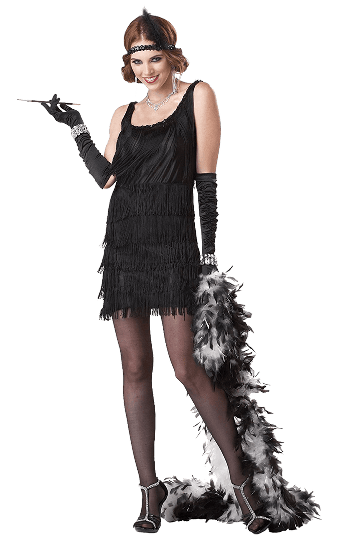 The Fashion Flapper black costume includes a flapper dress with tassels covering the front as well as the back of the dress, with a sequin neckline and a headband with attached feather. Other accessories are available separately.