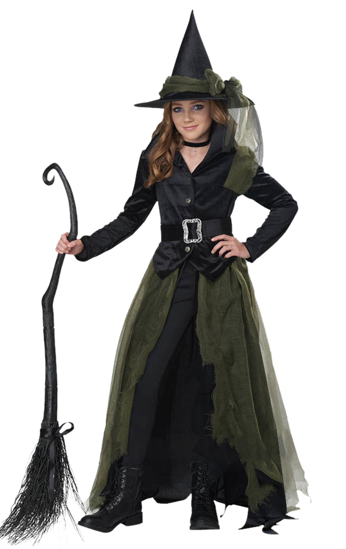 This Halloween, your little one will be the coolest cackler on the block! The Kids Cool Witch Costume is unique in style and perfect for keeping your little one warm during a chilly trick-or-treating trip! This girls witch costume features a black jacket with a silver buckled belt, a hat with green ribbon tie and a matching overskirt that also be worn as a cape! Just match this spooky costume up with a broomstick and she’ll be flying in no time.