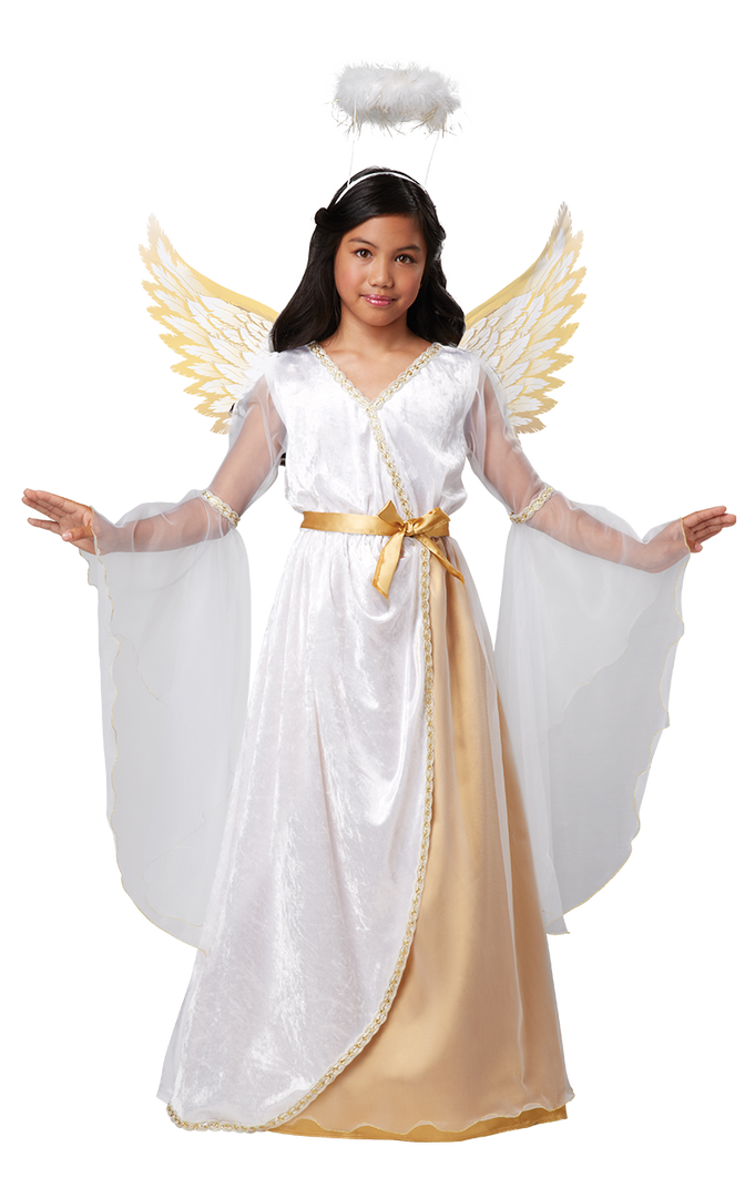 The Children’s Guardian Angel Costume is made up of white dress with gold detailing and a gold bow tied around the waist. It also includes sheer flared arms and a beautiful pair of white and gold wings. Completing the angelic look is a white faux fur halo, which gives it a classic and elegant finish.