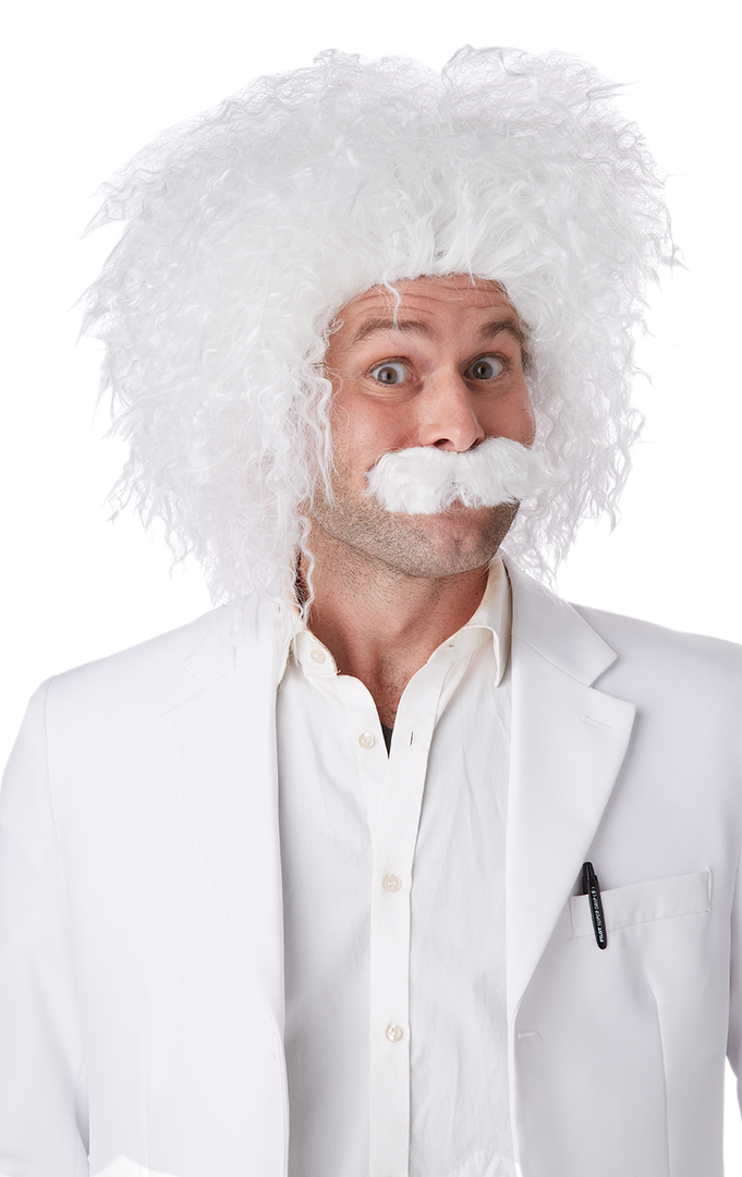 The E=MC2 Wig and Moustache features a white self adhesive moustache and a whacky scientist style wig.