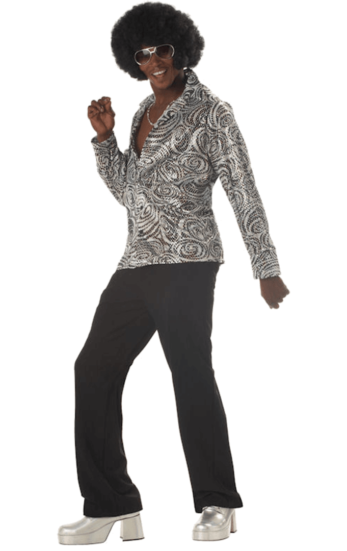 The Mens Groovy Disco Shirt & Wig Costume includes a white and black long-sleeved shirt, with a swirl pattern and fly collar. It’s covered in sequins to give you that wow factor as you shine extra bright on the dancefloor. Completing the look is a black afro wig. You just wouldn’t be the same without it!