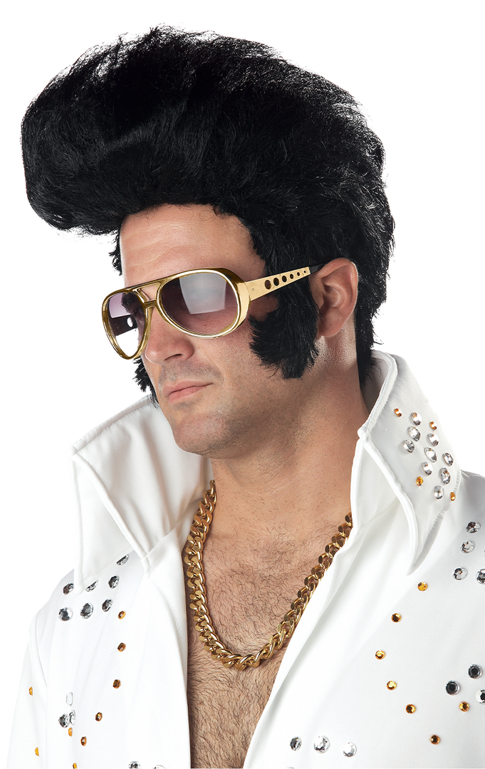 Elvis wig with sideburns and high quiff. Glasses and other accessories are available separately.