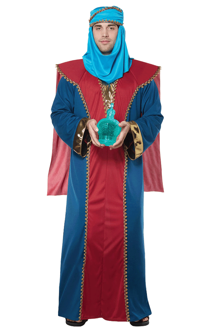The Men’s Balthazar Three Wise Men Costume includes a magnificent floor length navy and red robe that’s trimmed with intricate gold detailing. It also includes a an attached red cape. To complete the look is a blue turban with gold detailing, which will have you looking exquisite and ready to take on the role.