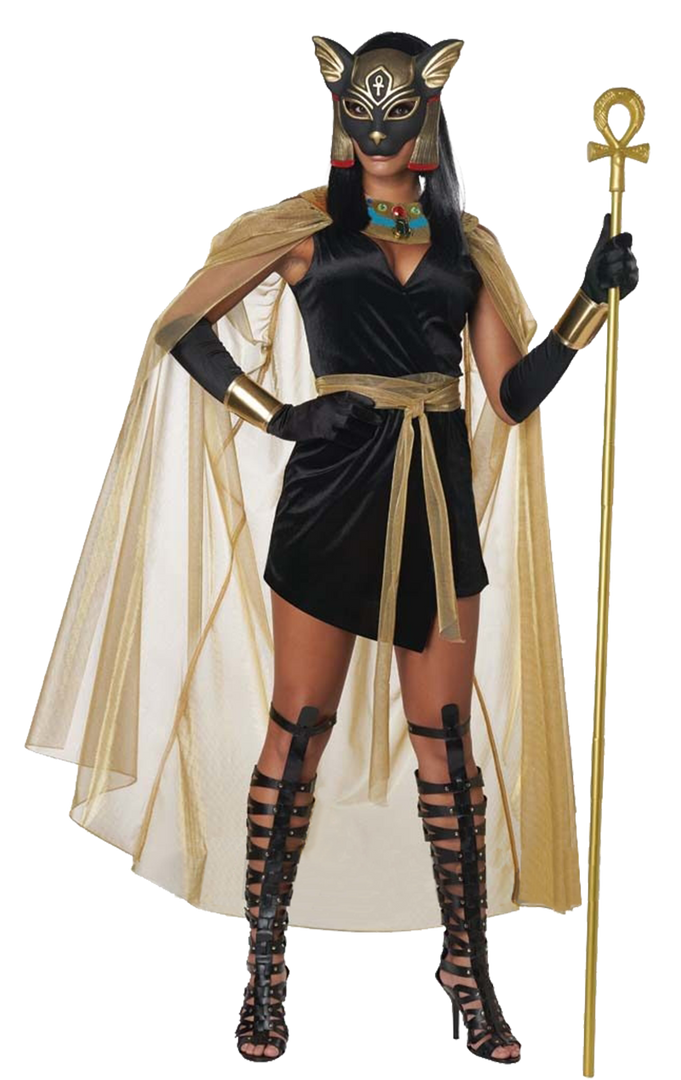 Become the beautiful ancient Egyptian Bastet the Cat, Goddess of Protection in the Womens Bastet Egyptian Goddess Costume. This sexy and slick high-quality costume features a black wrap dress with a plunging neckline, a gold sheer fabric belt, a matching cape attached to an Egyptian collar, gold wrist cuffs and a black and gold cat facepiece. Team up with a Pharaoh for the ultimate couples costume whether you’re celebrating Halloween or attending an Around The World themed party.