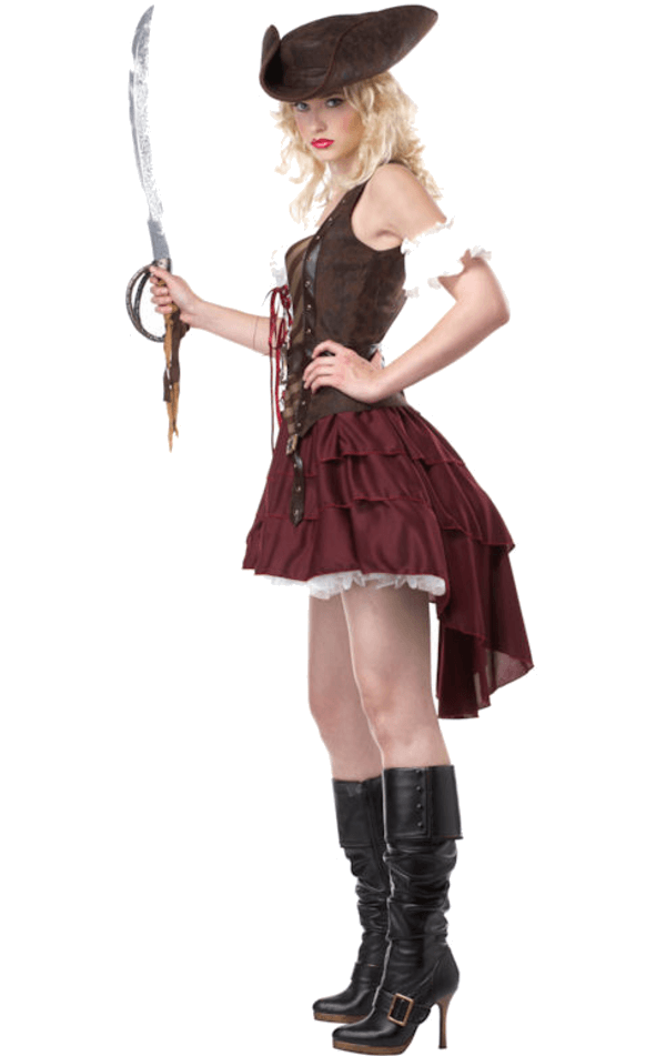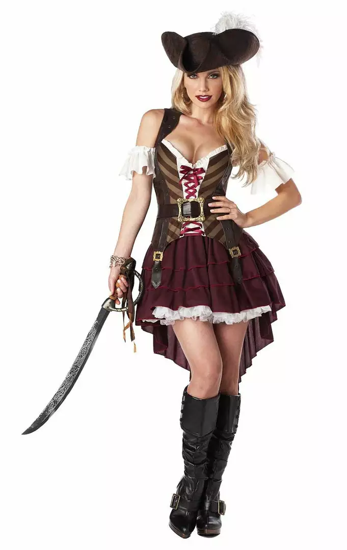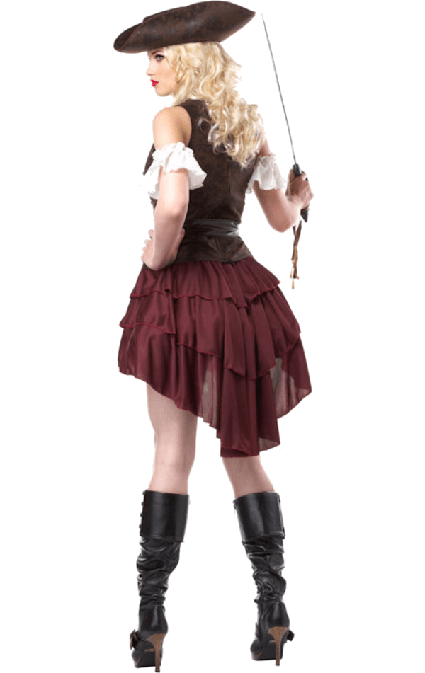 The Women’s Sexy Swashbuckler Pirate Costume comes complete with a low-cut corset top with red ribbon detailing at the front. Also included is a brown skirt with a white underskirt, which is shorter at the front and slightly longer at the back. To glam up your look even further, the outfit also features a pair of white sleeves, a black belt with gold clasp detailing, and finally, a brown pirate hat with a white feather at the back.