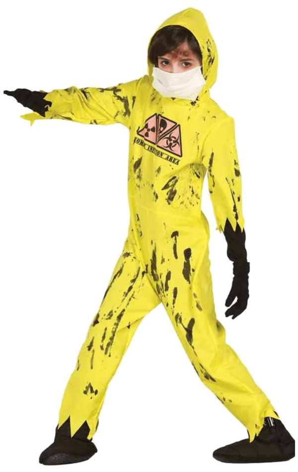 Infect the world in our Kids Halloween Nuclear Zombie Costume. You’ll look utterly toxic in this bright yellow ensemble. No one will want to bother you for fear of intoxication. Spice up your trick-or-treat with this modern take on the traditional zombie costume. Includes hooded jumpsuit only. Take it a step further with one of our zombie make up kits!