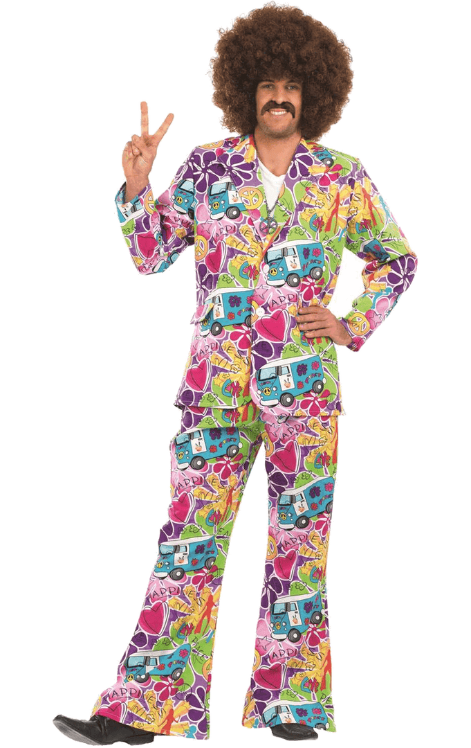 Flared trousers were a hit back in 60s and 70s, so luckily for you, our costume features a pair of flared trousers, with images of campervans, flowers, hearts and peace signs. The costume also comes with a matching jacket and faux pocket detailing.