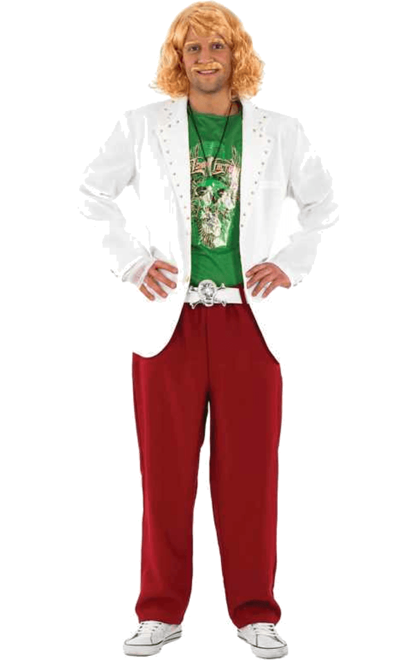 Our hilarious game show host costume includes a white blazer with silver studs on the collar breast of the jacket, a t-shirt, and a pair of burgundy trousers. To complement the outfit and to recreate the Keith Lemon look, the costume also features a ginger wig, moustache, shark tooth necklace and his signature hand bandage.