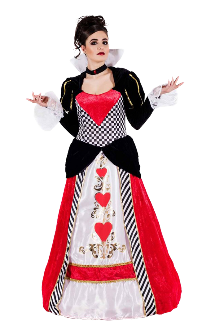 The Adult Queen of Hearts Costume is made up of an incredible full length fairy-tale dress. It features a variety of patterns and colours, including white and black checks, red heart motifs and intricate gold detailing. The dress also displays a stand-up collar, a checkerboard bodice and puffed black and gold sleeves that are trimmed with white lace. Completing your royal attire is a matching black choker with a red jewel in the centre.