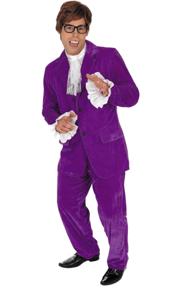 The Austin Powers costume features a dark purple velvet style material jacket with two buttons. There is also a white shirt with a lace collar and lace cravat detailing to create that 60’s vibe. It comes complete with a pair of matching trousers.