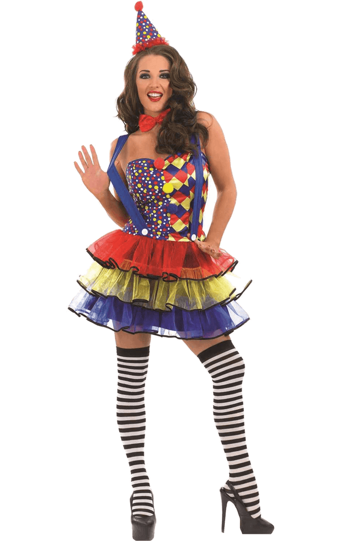 Get ready to party in the circus tent with this Womens Sexy Clown Costume complete with bow-tie, hat and stockings. Be the colourful comedienne in this dress with ruffled skirt and attached braces, and show off your curves in this tight costume. Perfect for Halloween, this clown costume can easily become scary with the right accessories! Add a weapon, some demon-eye fashion lenses and lots of fake blood!