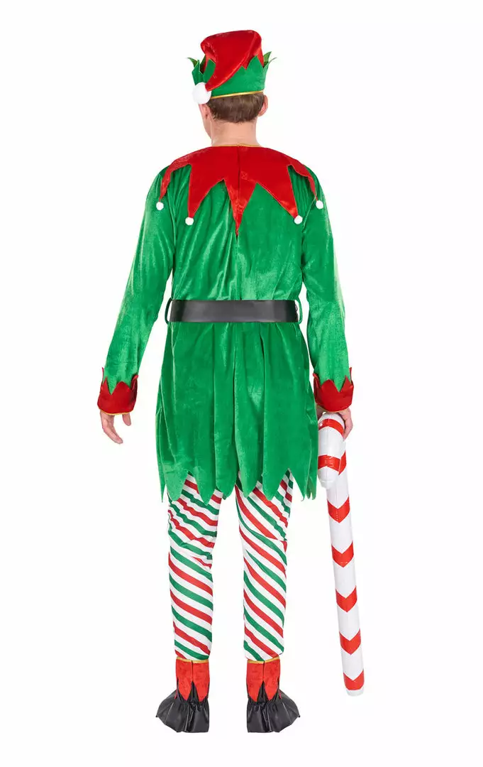 The Adult Deluxe Unisex Elf Costume is made up an all-in-one tunic with a velvet-like appearance and a decorative collar. Multi-coloured striped leggings, a belt, shoe covers and matching elf hat complete the festive look.
