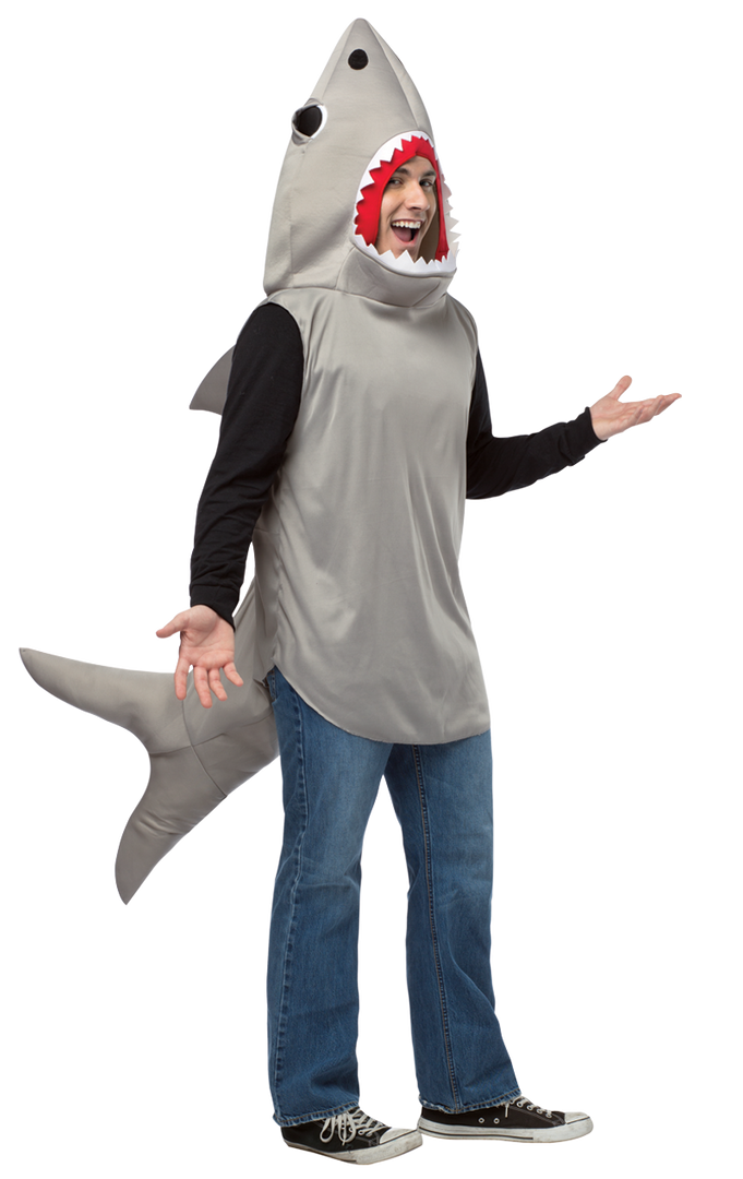 The Adult Shark Costume is lightweight and can easily be worn over your clothes. Headpiece, fin and tail are attached. Please note: T-shirt and trousers are not included.