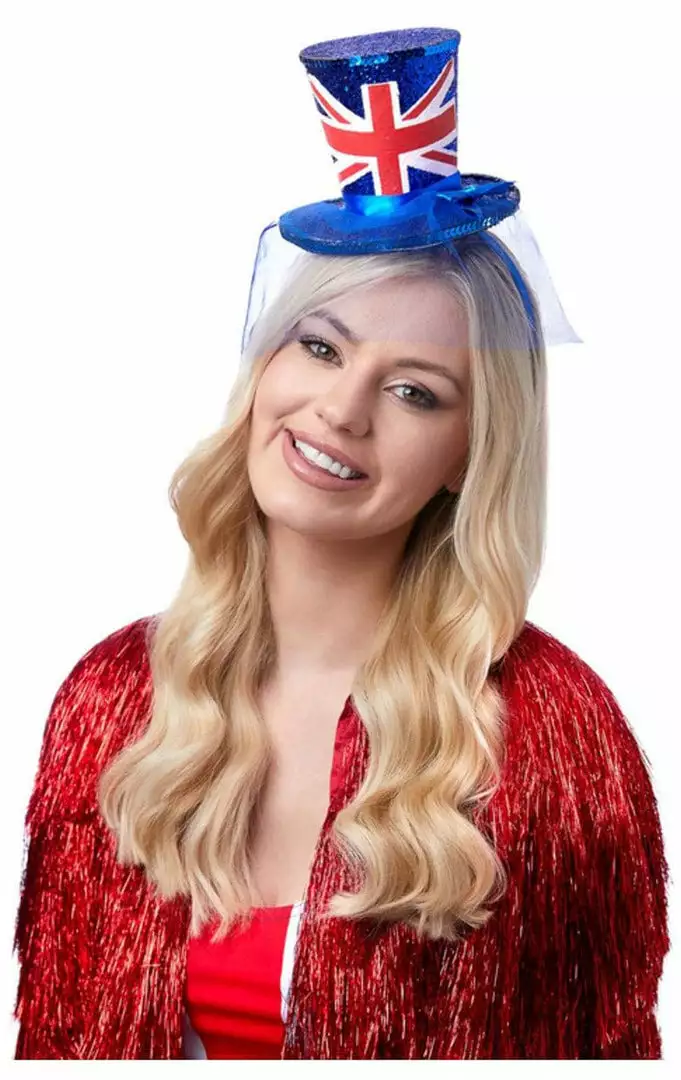 Our Ladies Union Jack Mini Sequin Top Hat features a blue headband with a mini top hat, which is slightly off centre. The top hat has sequins all over, giving it a stand out, glamourous finish. Combine it with your normal clothing or a full blown red, white and blue outfit and proudly represent the UK.