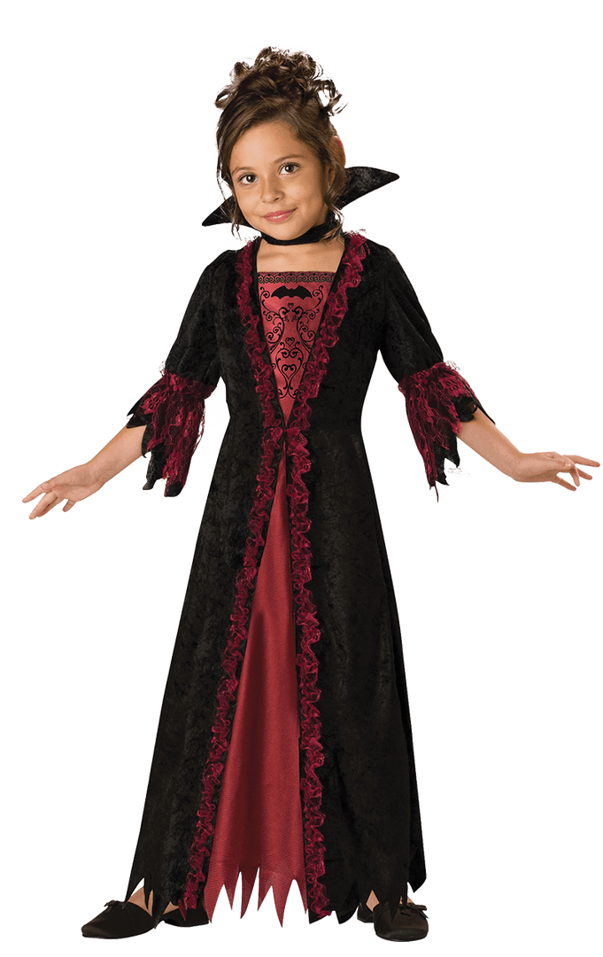 The little Vampiress costume includes a full length red and black velveteen dress that features a front bodice with bat pattern printed on it. Sleeves are three quarter length with jagged edges. Also included in the pack is a collar choker that stands up. Other accessories and available separately.