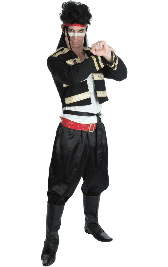 The New Romantic costume Jacket with gold lace, shirt with frills, puffy trousers with red adjustable belt, black ribbon belt and red ribbon headband. Please note wigs and other accessories are available separately.