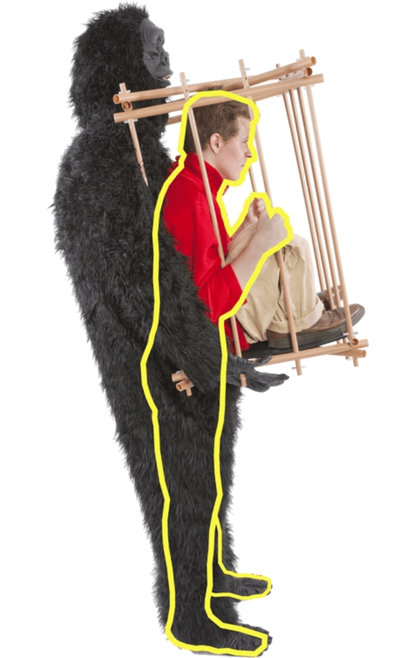 Includes: Plastic Cage Kit, Gorilla Suit and Headpiece, Gorilla Socks, Gorilla Feet, Harness, Filler Bag, Knee Inserts, Rubber bands