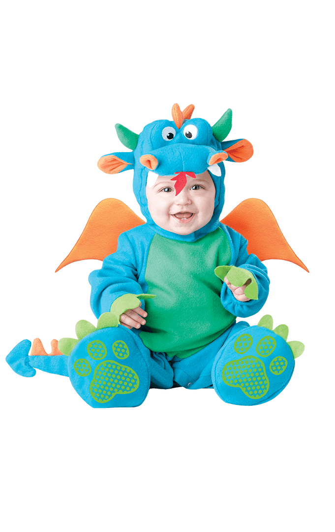Our Baby Dragon Costume is made up of a blue and green jumpsuit, complete with a pair of attached orange wings. It even has non-skid pads on the feet to ensure your mini dragon doesn’t get over zealous whilst crawling around! The outfit also features a detachable hood that your baby’s little face will poke out of.