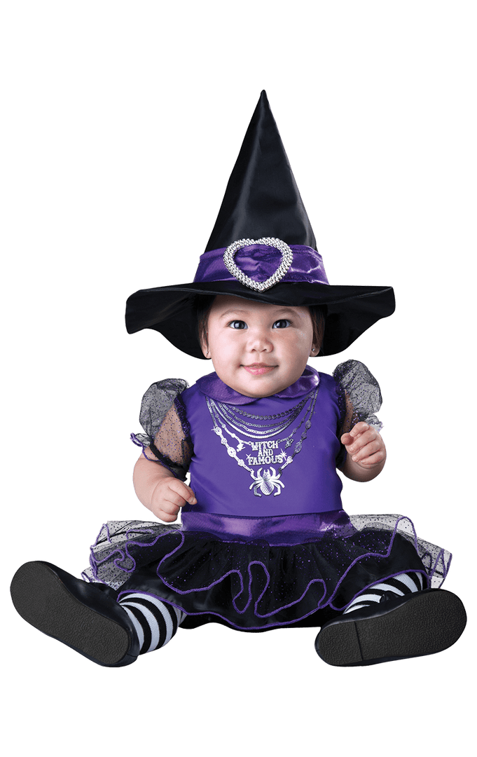 Our Baby Witch & Famous Costume comes complete with a dark purple and black dress, with the top half being lighter in colour. It also features an image of a spider and the words, ‘witch and famous’ written in silver. The skirt is black, with a dark purple rim, and it poofs out a little. Last, but certainly not least, is our black pointy witch’s hat, which has purple ribbon and a silver red heart wrapped around it.