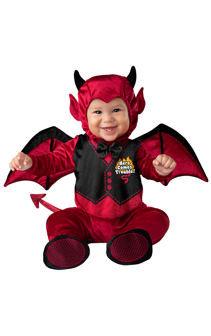 Our Lil Devil Baby Costume comes complete with an all-in-one onesie that’s of a dark red colour. It features a black waistcoat with the words, ‘here comes trouble,’ and includes a black bow tie. This comfortable onesie features non-slip feet, making it easy for your little one to crawl or walk around on their first night of trick-or-treating. The baby Halloween costume also comes with detachable wings, and a character hood with black devil horns.