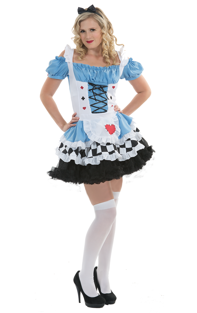 This Miss Wonderland Costume features a blue dress with off the shoulder sleeves, an attached white apron with an adjustable ribbon lace-up corset-style bodice and a chequer print skirt hem with layers of thrills and lace.