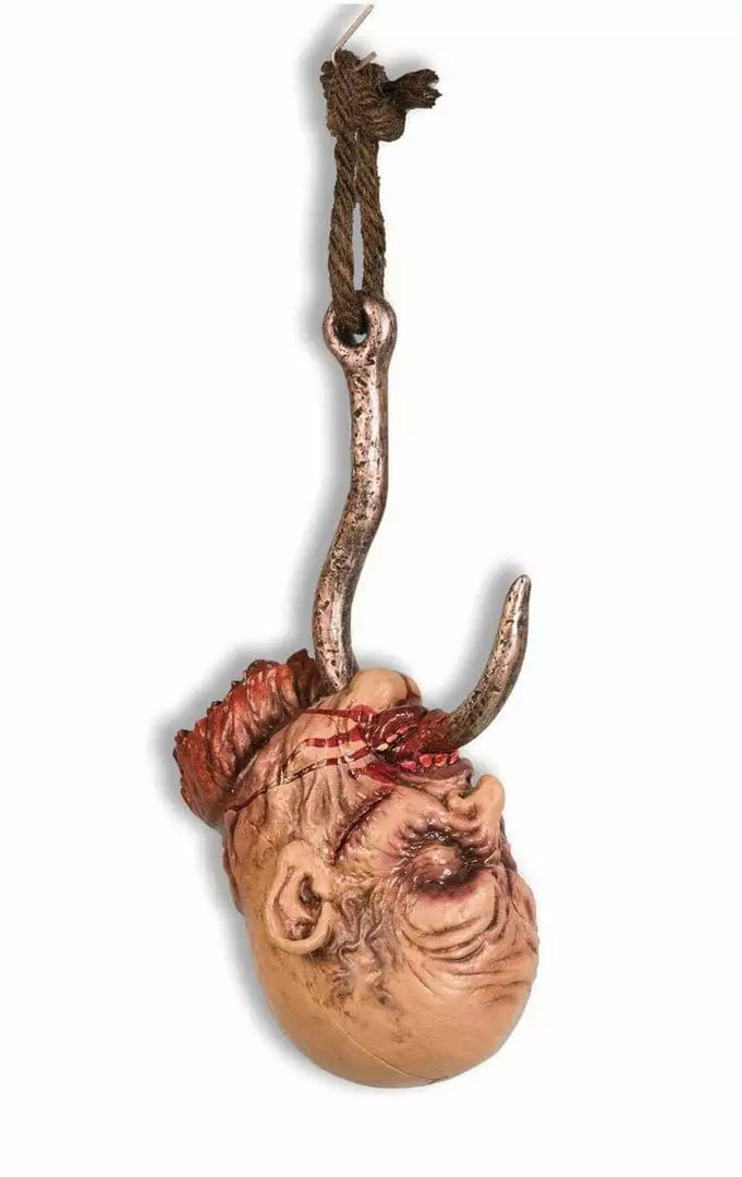 Transform your home into a gruesome human butcher shop or a serial killers workshop with this Hooked Head Hanging Decoration! Scare of trick or treaters with this gory one!