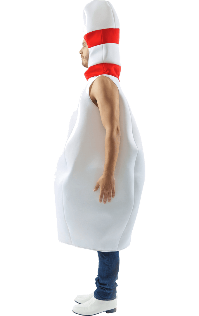 Our Adult Bowling Pin Costume features an all-in-one white suit with an arm hole on either side. It also include a matching headpiece with a red band accent, completing your look as the world’s most stylish bowling pin.