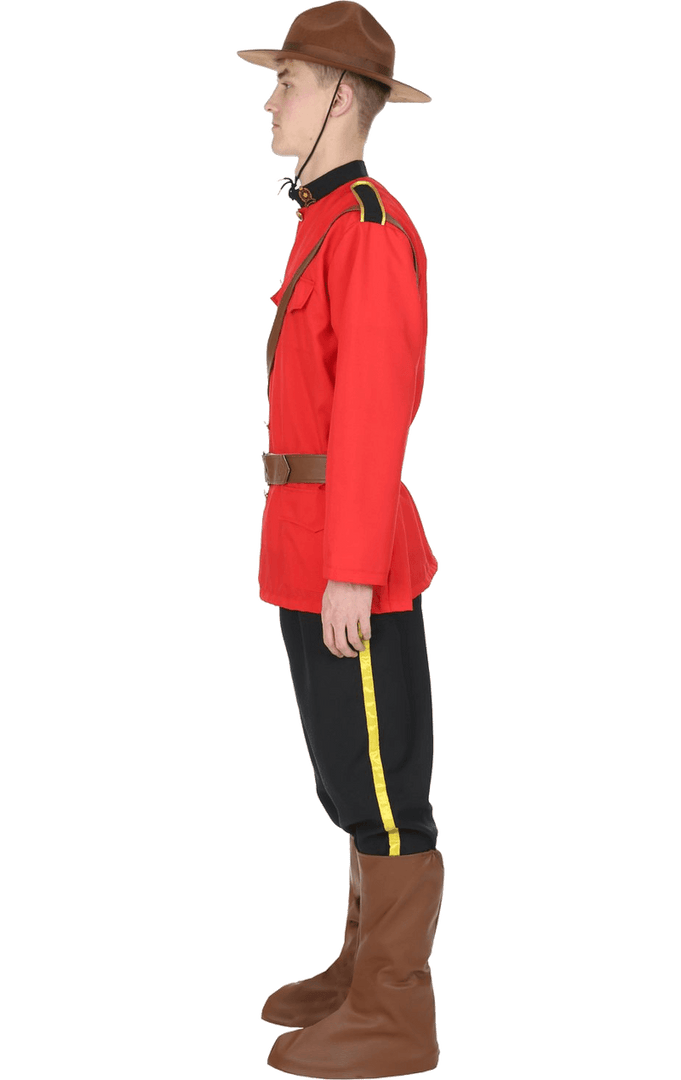 The Adult Canadian Mountie Costume is made up of a red jacket with gold button detailing, black trousers with yellow stripes, tall brown boot covers and a matching Stetson hat with a wide flat brim. You’ll look just like an official, suited and booted and ready for business guard.