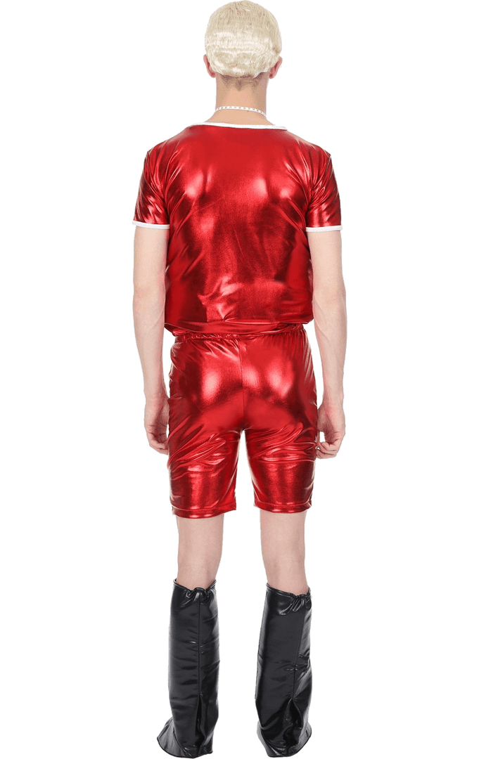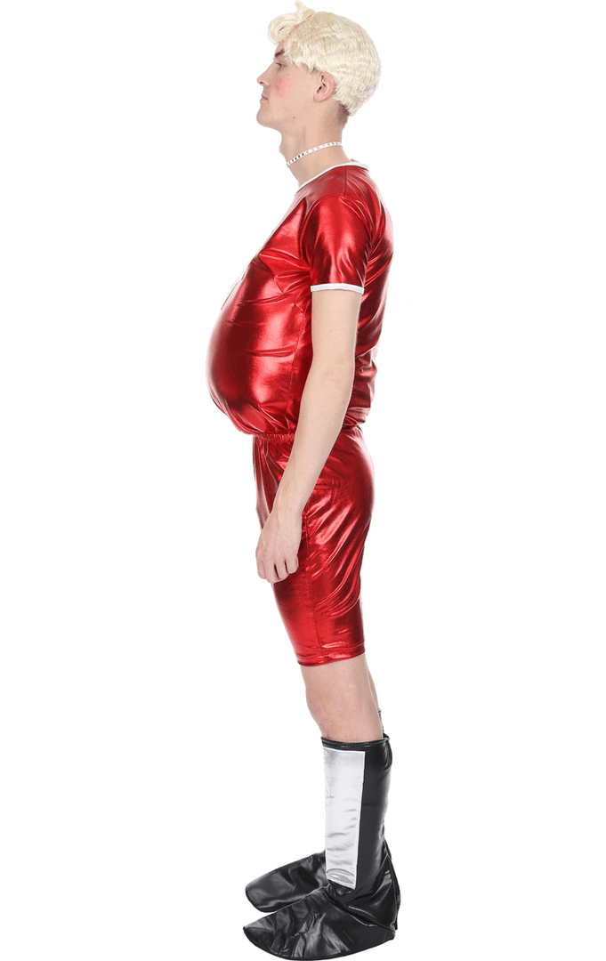 The Adult Daffyd Thomas TV Costume features figure-hugging, metallic finish red shorts, plus a matching top with a white cross printed on the front. The costume also comes with silver and black metallic boot covers, a platinum blonde wig and a silver choker. You’ll look exactly like good old Daffyd!