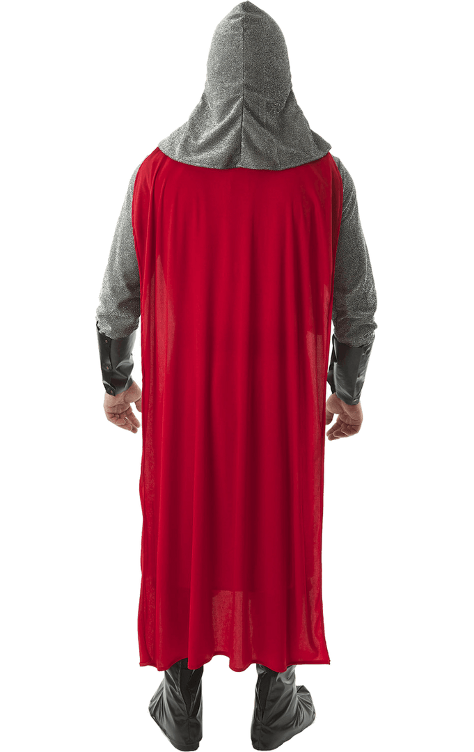 The Adult Knight Crusader Costume is made up of a full body-length tunic that’s printed with the England flag. It also features a grey top and trousers, both printed to look like the classic chainmail armour. Completing your knight look is a range of accessories, including a red cape, a pair of brown wrist cuffs, a black belt, black boot covers and a grey headpiece.