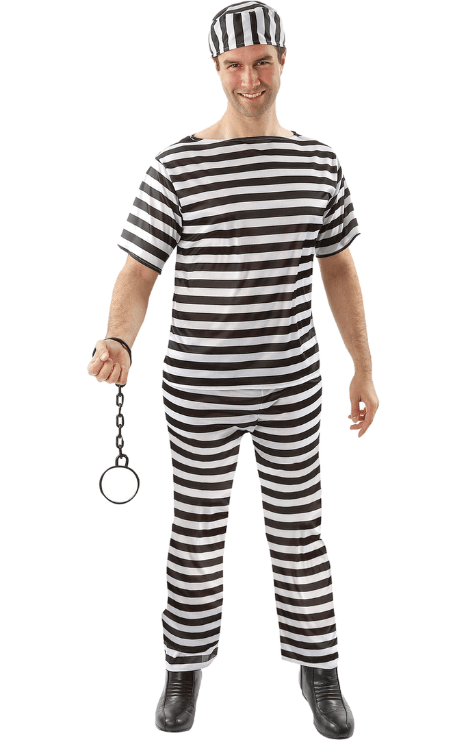 The Adult Prison Convict Costume is made up of a black and white striped top with the matching trousers in the same pattern. Completing look is a matching striped black and white hat , completing your classic prisoner look.