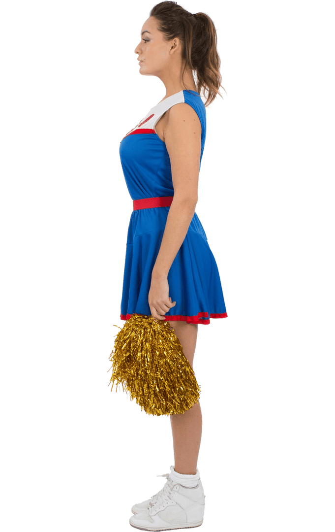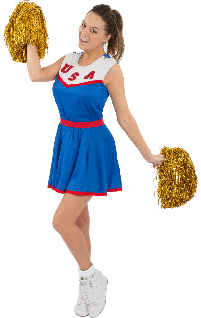 The Adult USA Cheerleader Costume is made up of a vibrant blue skirt with a red trim. It also includes a matching blue top with white detailing across the chest, and a neckline with ‘USA’ printed in red. Adding some shimmer to your look is a pair of glistening gold tinsel pom poms, giving you everything you need to chant, cheer and inspire your team.