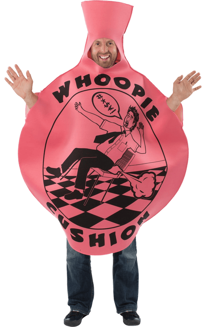 The Whoopee Cushion Novelty Cushion Costume is a giant pink whoopee cushion bodysuit with a cut out for the face, hands, and legs. The front of the costume is printed with a black retro photo, with the words ‘whoopee cushion’, so nobody will mistake who you are.