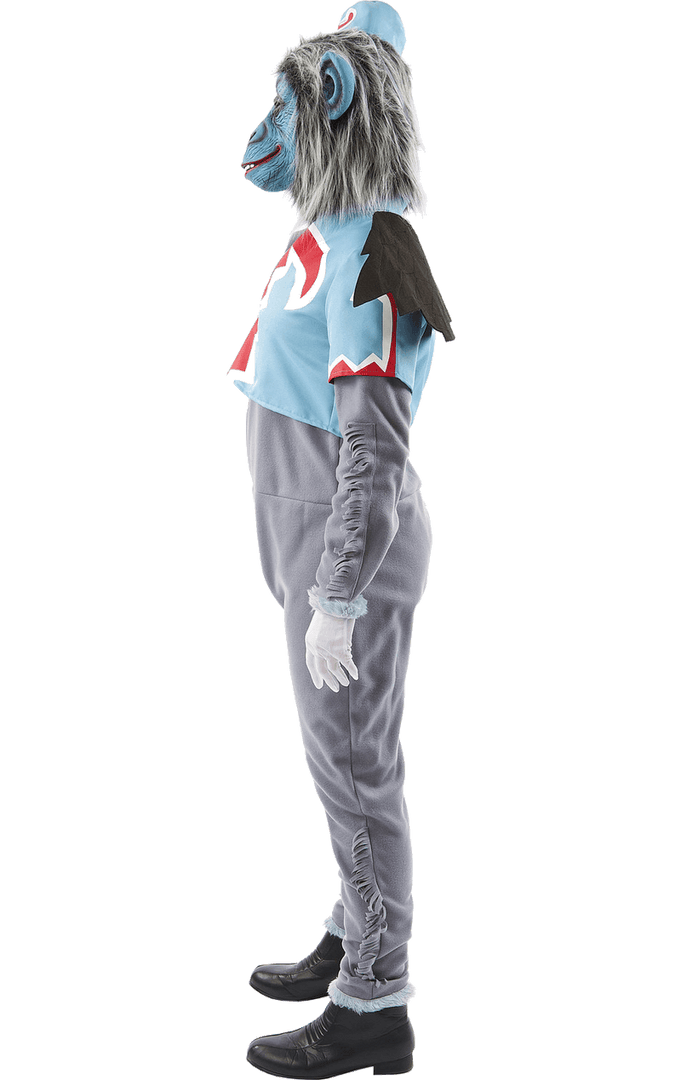 The Adult Wizard of Oz Flying Monkey Costume is made up of an all-in-one fleece grey jumpsuit with the famous red, white, and blue patterned top, as seen in the movie. It also includes a set of detachable wings that connect to the back of the outfit.