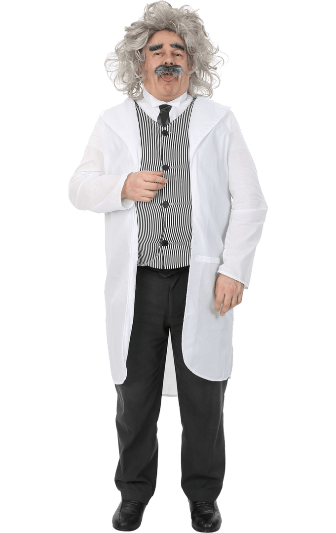 Includes: Lab Coat, Waistcoat with Attached Shirt, Moustache, Eyebrows, Wig