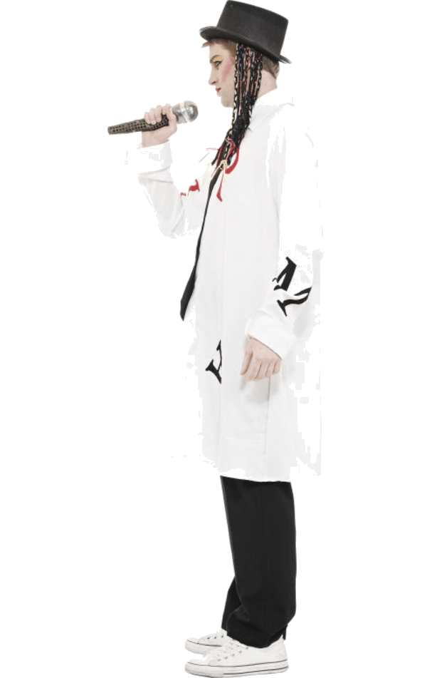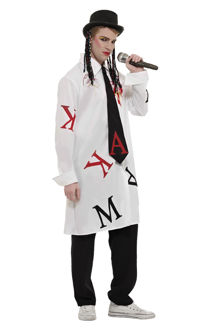 The Adult Boy George Karma Costume is made up of an oversized white shirt with large black and red letters printed on the front, as well as a an attached black tie. The costume also includes a black top hat with attached hair and a microphone, so you can sing and entertain all night long.