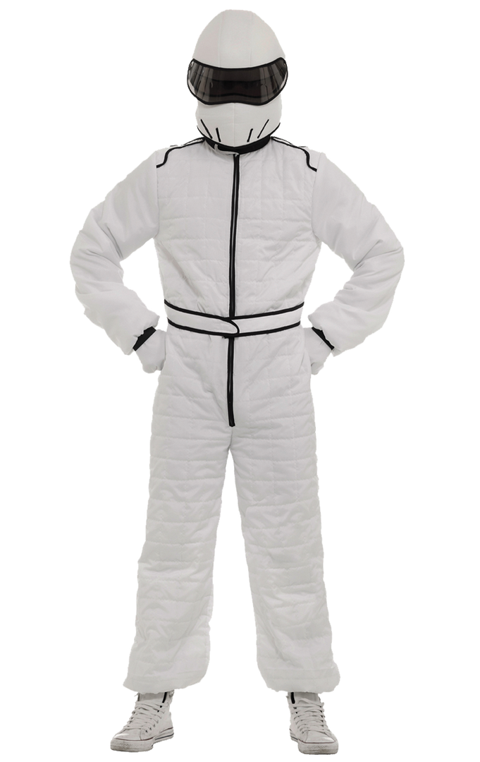 The Adult Top Gear The Stig Costume is made up of an all-in-one white jumpsuit with black detailing around the zip, cuffs and waist. The costume also includes a pair of matching white gloves and the all-important race helmet to disguise your identity.