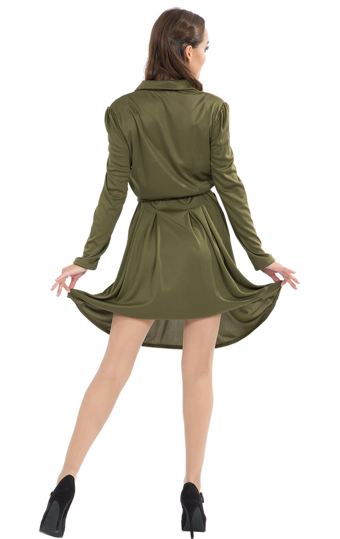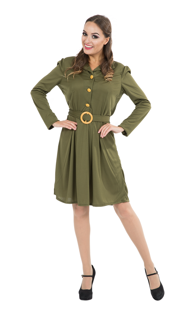 The Womens World War 2 Military Dress is a knee length khaki green dress with gold button detailing on the front. The dress also features a belt to pull you in at the waist, and slightly padded shoulders for a comfortable but glamourous fit.