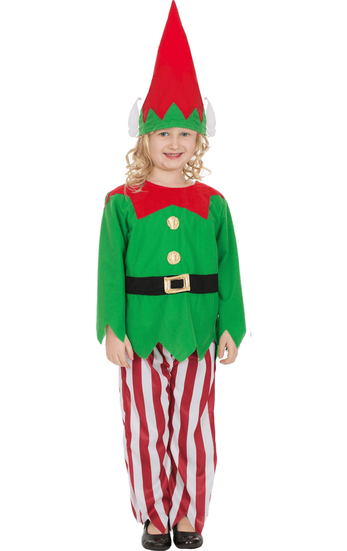 Santa has a LOT of presents to deliver this Christmas, so he needs the help of his Elves looking tip-top! Let your little one become the best helper of all in our Kids Striped Elf Costume. Other than singing loud for all to hear, this costume is the best way to spread Christmas cheer! In fact, we think it’s the best Christmas costume idea we’ve seen all year! Perfect for Christmas parties and celebrations, this elf costume features a red and green long sleeve top with printed gold button and belt details, a pair of red and white striped trousers and a pointed hat with attached ears. This elf costume is perfect for boys and girls too, so no one misses out on the fun!