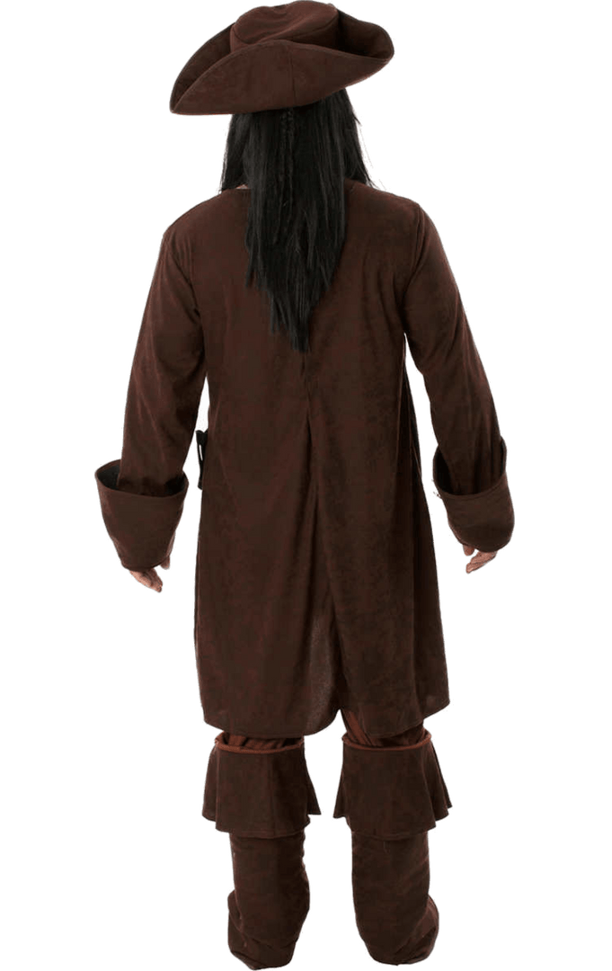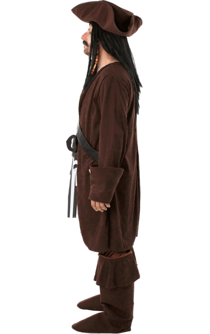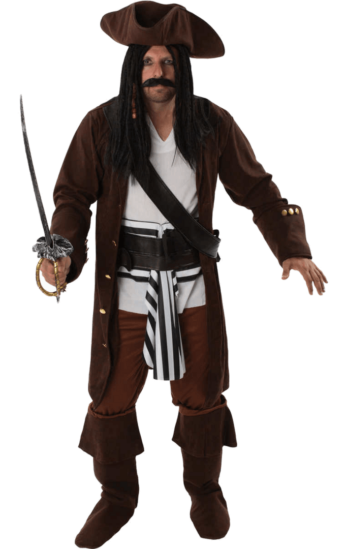 The Men’s Caribbean Pirate Costume is made up of a long brown jacket with large cuffs and gold buttons. It also features an attached white top, a thick black belt and striped rags hanging from the front. A pair of matching trousers are included too. To complete your adventurous pirate look is a classic brown hat, so you can look just like the captain of the Black Pearl.