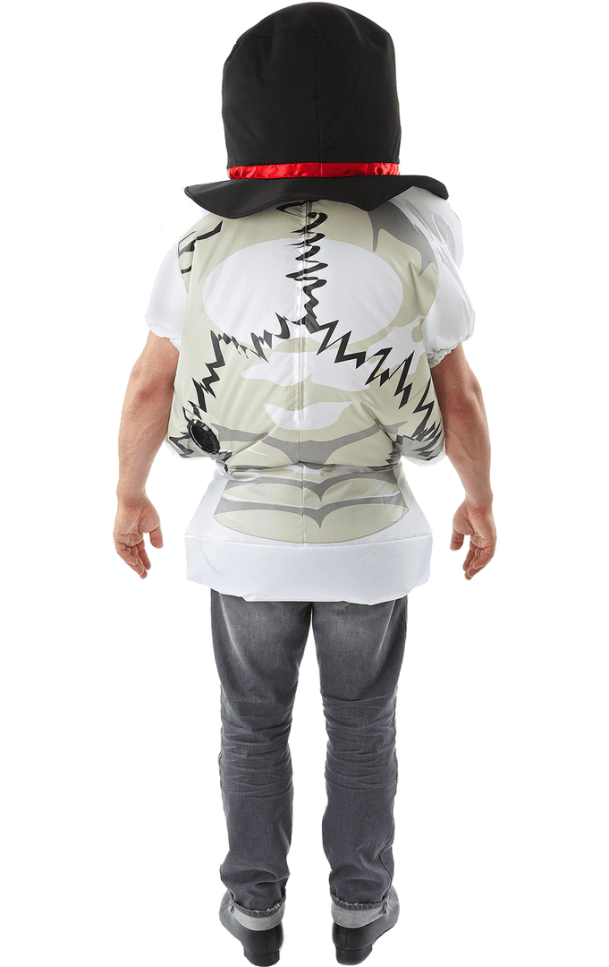 Completing the skeleton look is a large black top hat with a red ribbon tied around. This not only conceals your identity but features a square mesh patch on the front so you can see through. The skull is inflated by a small fan that attaches to the costume at the waist, with a battery pack to clip onto your waistband or belt.