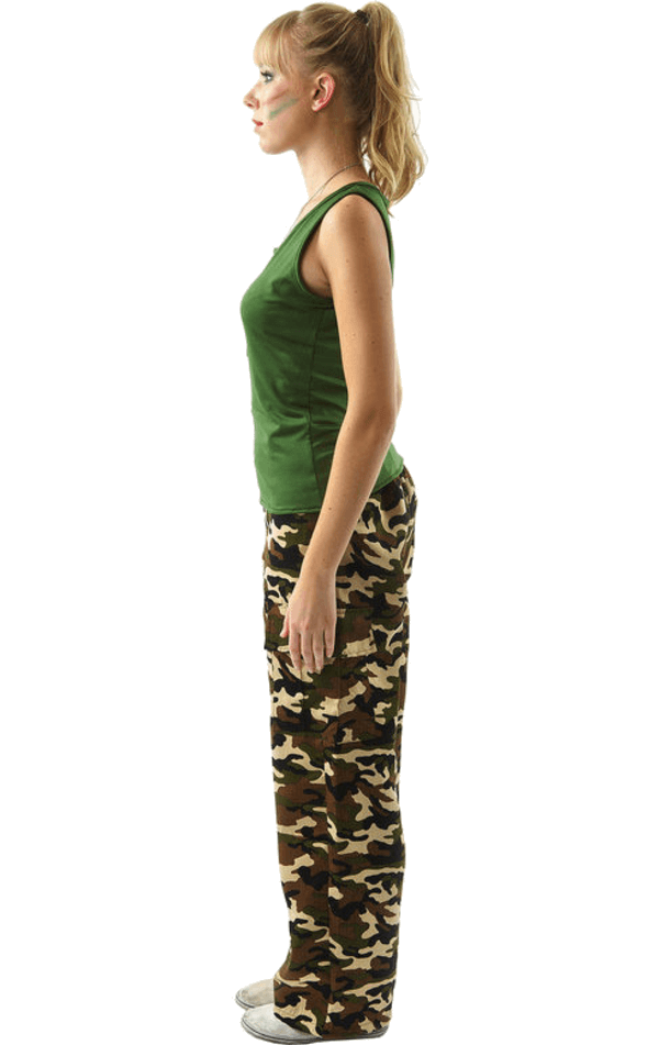 The Ladies Camo Army Costume is made up of a scoop neck khaki vest top. It has the perfect fit for a comfortable but figure-hugging look. The costume also includes a pair of baggy-fit combat trousers in a camouflage design. The trousers feature belt hoops and are half elasticated for a comfortable but secure fit, with a drawstring hem around the ankles so you can easily tuck them into some army boots.