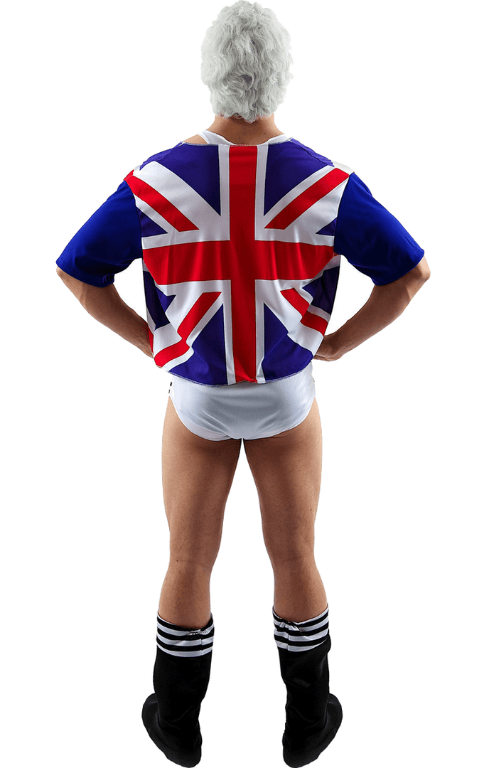 The Mens Big Daddy Wrestler Costume includes a white, sleeveless, all-in-one bodysuit, with the words ‘Big Daddy’ printed in black across the front. The costume also features a Union Jack throw on piece for over the shoulders, a platinum blonde wig and a pair of black boot covers with white stripes.